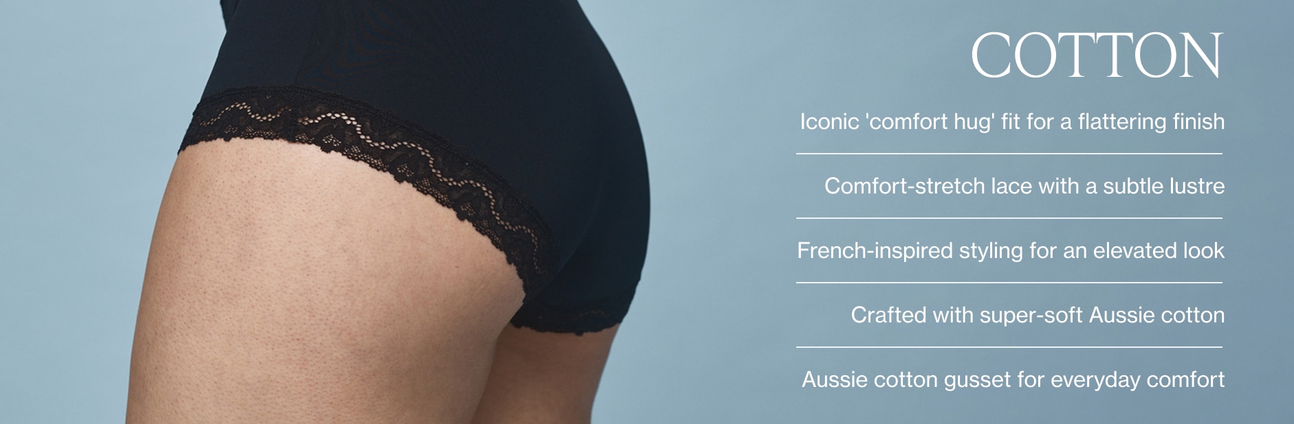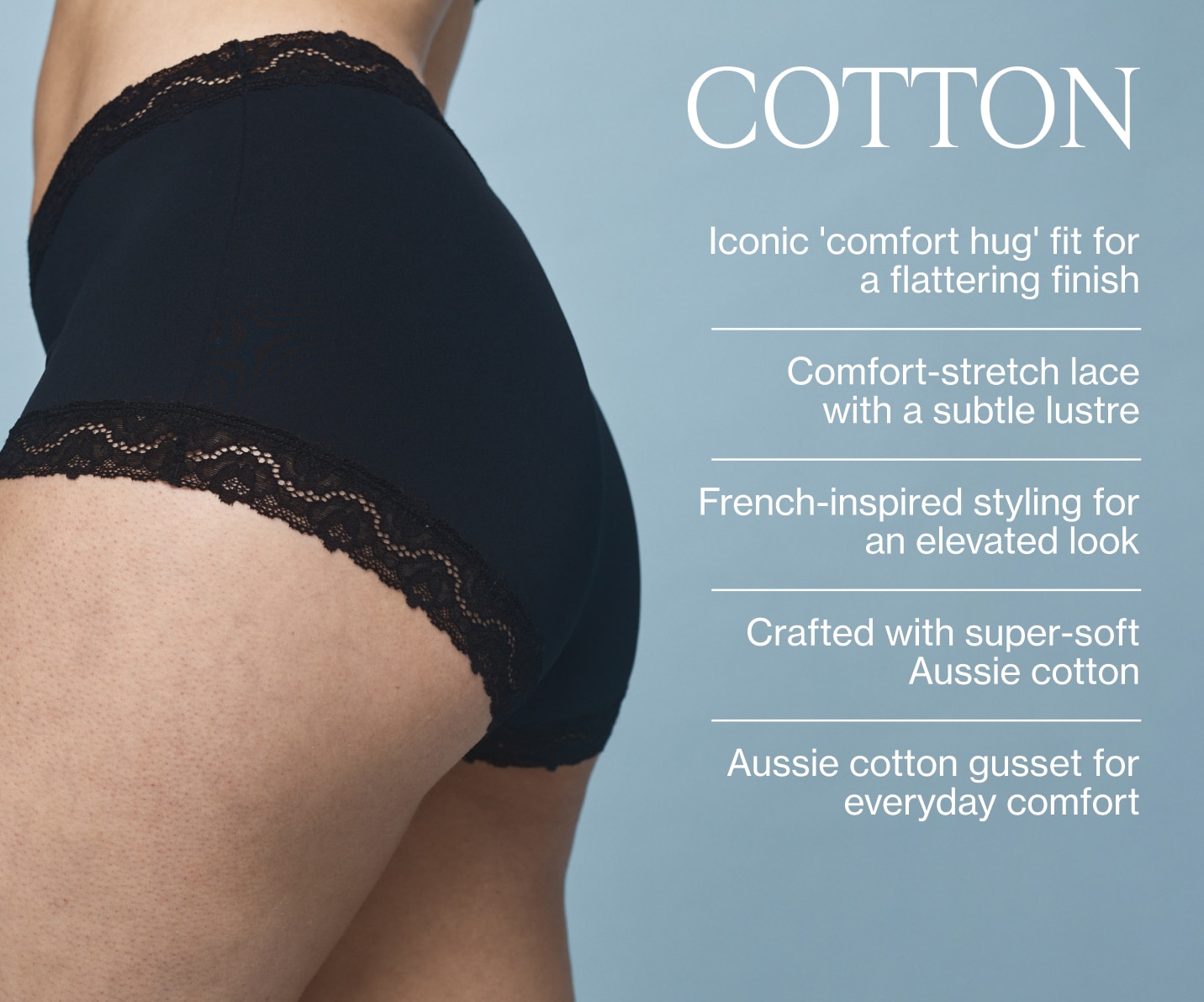 From top to bottom, Marais has you covered! Soft Aussie cotton, a comfy boyleg fit and details that make it feel a little special - all designed to pair perfectly with your favourite Berlei bras. Because a matching set just hits different.